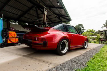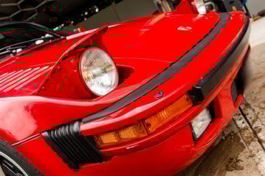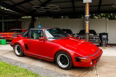 Este Porsche 911 Targa con conversiones estilo 930 Slantnose destaca por su agresivo diseño frontal tipo "Flachbau" y su silueta inconfundible. Restaurado con un enfoque que mezcla autenticidad y personalización, incluye rines Fuchs, interior con detalles en tartán y un estado mecánico impecable.
